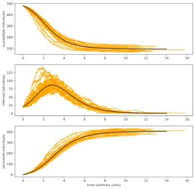 This system has no analytical solution. One approach could be to use the Gillespie algorithm, simulate the system many times, and use a regression technique such as least-squares to fit a polynomial over all of the trajectories. As the number of trajectories increases, such polynomial regression will asymptotically behave like the numerical solution (black lines). In addition to estimating the solution of an intractable problem like the SIR epidemic, the stochastic nature of each trajectory allows one to compute statistics other than . When running the script below, sometimes realizations of the SIR epidemic are obtained which differ drastically from the numerical solution. For example, when all persons are cured (by chance) very early, or very late.