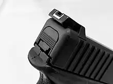 The slide features a spring-loaded claw extractor, and the stamped sheet metal ejector is pinned to the trigger mechanism housing.[56] Pistols after 2002 have a reshaped extractor that serves as a loaded chamber indicator. When a cartridge is present in the chamber, a tactile metal edge protrudes slightly out immediately behind the ejection port on the right side of the slide.[57] The striker firing mechanism has a spring-loaded firing pin that is cocked in two stages that the firing pin spring powers. The factory-standard firing pin spring is rated at 24 N (5.4 lbf), but by using a modified firing pin spring, it can be increased to 28 N (6.3 lbf) or to 31 N (7.0 lbf).[58] When the pistol is charged, the firing pin is in the half-cock position. As the trigger is pulled, the firing pin is then fully cocked. At the end of its travel, the trigger bar is tilted downward by the connector, releasing the firing pin to fire the cartridge. The connector resets the trigger bar so that the firing pin will be captured in half-cock at the end of the firing cycle. This is known as a preset trigger mechanism, referred to as the "Safe Action" trigger by the manufacturer. The connector ensures the pistol can only fire semiautomatically.
