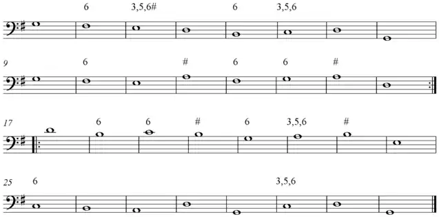 The digits above the notes indicate the specified chord in the system of figured bass; where digits are separated by comma, they indicate different options taken in different variations.
