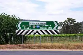 The Golden Highway provides a fairly low altitude crossing of the Great Dividing Range.[3] It runs through the Hunter Region[4] and gives access to the golden west of New South Wales.[5]