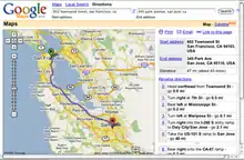 Google Maps provides a route planner,[54] allowing users to find available directions through driving, public transportation, walking, or biking.[55] Google has partnered globally with over 800 public transportation providers to adopt General Transit Feed Specification (GTFS), making the data available to third parties.[56][57] The app can indicate users' transit route in an October 2019 update. The incognito mode, eyes-free walking navigation features were released earlier.[58] A July 2020 update provided bike share routes.[59]
