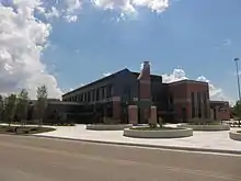 The University's main and original campus in Allendale is the site of most of the university's programs. The Allendale campus is composed of 1,322 acres perched above the Grand River next to a system of ravines and is divided into two areas, north and south campus, separated by West Campus Drive.[26][27] State highway M-45 links the campus in suburban Allendale to US Highway 31/Lake Michigan to the west and Grand Rapids, Michigan to the east. Lubbers Stadium, the GVSU Fieldhouse and all other athletic facilities for the school's 19 varsity sports are also on the Allendale campus. The campus is dotted with many sculptures, including works by Dale Eldred, Joseph Kinnebrew and James Clover. Academic facilities on the Allendale campus include 122 classrooms, 144 research laboratories, 20 lab prep rooms, 21 computer labs, and the Mary Idema Pew Library Learning and Information Commons.[28] The Allendale campus is also home to the Kindschi Hall of Science, a science facility that opened in the fall of 2015.[29]