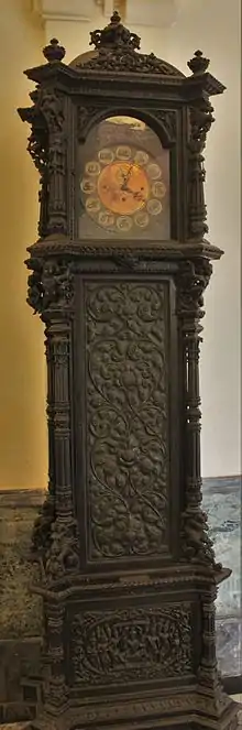 8-day longcase clock. This example dates back to 1700 and the case to late 19th – early 20th century CE. The original dial of this clock was replaced by a brass dial with Tamil numerals, perhaps around the same time as the case. The original long-case was also replaced by a mandapa-shaped wooden carved case done in South Indian style. The front and the side panels are done in metal repoussé work with floral meanders. The lower part of the case depicts mythological scenes and the case was manufactured at the Madras School of Arts. This clock is on display in The Prince of Wales Museum in Mumbai and was donated by Dorab Tata.
