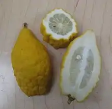 The Greek citron variety of Citrus medica (Greek: κιτριά, Hebrew: אתרוג קורפו or יְוָנִי) was botanically classified by Adolf Engler[1] as the "variety etrog". This is remarking on its major use for the Jewish ritual etrog during Sukkot.[2][3]