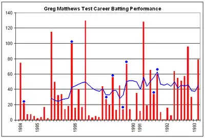 When Australian cricket was in the doldrums in the 1980s "his dashing batsmanship and growing ability as a spin bowler suddenly elevated Matthews to a position of a national hero".[1] He made centuries in times of crisis against New Zealand and India in 1985–86, took ten wickets in the Tied Test at Madras and batted well against England in 1986–87.