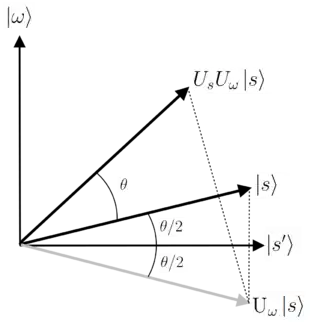 The operator is a reflection at the hyperplane orthogonal to for vectors in the plane spanned by and , i.e. it acts as a reflection across . The operator is a reflection through . Therefore, the state vector remains in the plane spanned by and after each application of the operators and , and it is straightforward to check that the operator of each Grover iteration step rotates the state vector by an angle of .