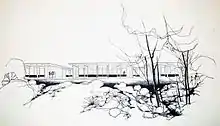 During the 1960s, Bell's focal projects were based on his interest with homesteads. The Drysdale House, set on Killcare Heights, has spectacular views over inland waterways and distant hills which set the design theme of the house – "Everything should face that view which must be framed and punctuated."[6] The design consists of three separate pavilions connected by courtyards and lower roofed gallery halls. An important element of the design is the structural beams which begin to be expressed internally, and continue to exit externally to frame the northern facing view.