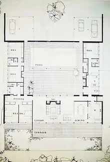 The modernist approach that the Bell Clerehan Partnership adopted for the design of the Simon House, is very prototypical of Bell's architectural style. Being a countryman, the relationship between the land and architecture was very significant to Bell. This is why "an integrated sequence of interior and exterior spaces",[4] was affiliated to combine the living quarters around a centred terrace and swimming pool. Glazed panels wrap the living and dining room spaces, to fully appreciate the views of the Mornington Peninsula. Symmetry is abundant throughout the single-storey floor plan and program is mirrored in an even trend throughout. This project won the "Victorian Architectural Medal" in 1963–64.[5]