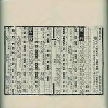 It has already been discussed that qin music has a rhythm and that it is only vaguely indicated in the tablature.[35] Though there is an amount of guesswork involved, the tablature has clues to indicate rhythm, such as repeating motifs, an indication of phrases or how the notation is arranged. Throughout the history of the qinpu, we see many attempts to indicate this rhythm more explicitly, involving devices like dots to make beats. Probably, one of the major projects to regulate the rhythm to a large scale was the compilers of the Qinxue Congshu tablature collection of the 1910s to 1930s. The construction of the written tablature was divided into two columns. The first was further divided into about three lines of a grid, each line indicating a varied combination of lyrics, gongche tablature, se tablature, pitch, and/or beats depending on the score used. The second column was devoted to qin tablature.