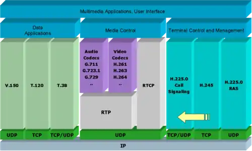 Inside an H.323 terminal is something referred to as a Protocol stack, which implements the functionality defined by the H.323 system. The protocol stack would include an implementation of the basic protocol defined in ITU-T Recommendation H.225.0 and H.245, as well as RTP or other protocols described above.