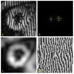HARP processing uses a bandpass filter to isolate one of the spectral peaks. For example, the circle drawn in (b) is the -3 dB isocontour of the bandpass filter used to process this data. Selection of the filters for optimal performance is discussed in this paper.[14] The inverse Fourier transform of the filtered image yields a complex harmonic image at image coordinates and time :