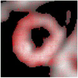The result of HARP tracking of one frame of cardiac MRI is shown in the figure. It is obtained by calculating both motions from horizontal direction and vertical direction, resulting in a 2D vector field showing the motion of every material point on the myocardium at this time frame.