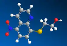 Inhibitor development remains in an early phase. The challenge of synthesizing a compound with a simple molecular structure and low molecular weight in order to limit side interactions and the existence potentially detrimental stereoisomers requires both a computational and high-throughput approach.[7] 2-((5-nitroquinolin-8-yl)thio)ethanol, a potential lead compound, is shown at right. It is selective for the loop structure of GSL3 over double and single stranded RNA. This implies that if released in a cell targeted by HIV, it would block the stem-loop and thus limit productive interaction with NCp7.[7]