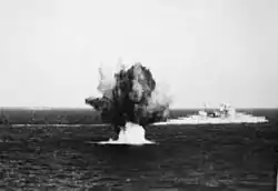 On 14 September Force H was recalled to the UK to begin preparations for the invasion of France, but Warspite and Valiant were detached to provide support for Allied forces at Salerno.[86] Although the Italians had surrendered, the Germans had anticipated this and moved forces into position to block the Allied landings. The American forces near Battipaglia were in a precarious situation following German counter-attacks.[95] After arriving off Salerno on 15 September, Warspite bombarded an ammunition dump and other positions around Altavilla Silentina, demoralising the German forces and providing time for Allied reinforcements to arrive.[96] Overnight the fleet came under intense air attack, but she was able to continue bombardment duties the next day. However, early in the afternoon she was attacked by a Luftwaffe squadron of Focke-Wulf Fw 190 fighter bombers and then, from high altitude, by three Dornier Do 217 bombers from KG 100 armed with an early guided bomb, the Fritz X.[97] She was hit directly once; a second near-miss ripped open the torpedo bulges while the third missed altogether. The bombs that did hit her struck near the funnel, cutting through her decks and making a 20-foot hole in the bottom of her hull, crippling her.[98] Although the damage had been considerable, Warspite's casualties amounted to only nine killed and fourteen wounded.