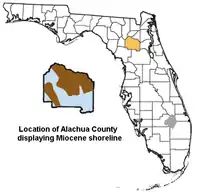 Alachua County, Florida and Miocene shoreline based on the Florida Geologic Survey.