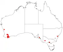 Hakea baxteri grows in the Stirling Range National Park and nearby locations in heathlands and mallee on sandy-loam and gravel.[6]