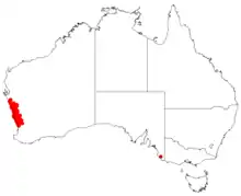 Ribbed hakea is endemic to an area along the west coast in the Wheatbelt and Mid West regions of Western Australia from about Kalbarri in the north to Yanchep in the south growing in sandy soils over limestone or laterite.[2][9]