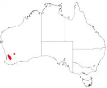 It is endemic to an area in the Wheatbelt region of Western Australia between Northam in the north down to Narrogin in the south. It is found in sandy gravelly soils often around laterite.[2] It is often found on and around breakaways and is a part of the understorey in open Eucalyptus wandoo and Eucalyptus accedens woodland communities.[3]