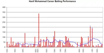 He played for the Pakistani cricket team in 55 Test matches between the 1952–53 season and the 1969–70 season. He averaged 43.98 scoring twelve centuries. At his peak, he was considered one of the best batsmen in the world despite playing at a time when Pakistan played very little Test cricket; Hanif played just 55 Test matches in a career spanning 17 years. In his obituary by ESPNcricinfo, he was honoured as the original Little Master, a title later assumed by Sunil Gavaskar and Sachin Tendulkar.[2] He was the first Pakistani to score a triple hundred in a Test match.[3]