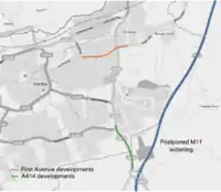 Essex County Council was involved in development to Harlow's First Avenue, which was intended to reduce congestion and create better transport connections between the Newhall housing developments. The scheme was implemented in two phases, each phase focusing on developing First Avenue on either side of Howard Way. Phase two had an estimated cost of £4.4 million and was due to be completed in early 2010, phase one is already complete and is listed as having had £3.6 million of funding from the Community Infrastructure Fund (CIF).[31] The scheme includes construction of a shared use cycleway and development to the bus service along First Avenue and into the Newhall development site where 'high quality bus' services between Harlow town centre and Harlow Town Railway station are listed as part of the intentions of the development.