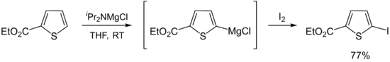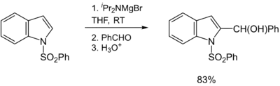 Hauser bases are generally used as metalation reagents, like organolithiums or metal amides. The breakthrough in synthetic protocols of Hauser bases culminates in the 1980s and 1990s. Eaton and coworkers showed that iPr2NMgBr selectively magnesiate carboxamides in ortho position.[11] Later, Kondo, Sakamo and co-workers reported the utility of iPr2NMgX (X = Cl, Br) as selective deprotonation reagents (exclusively at the 2-position) for heterocyclic thiophene [12] and phenylsulphonyl-substituted indoles.[13]