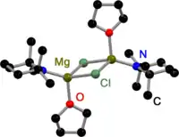 This equilibrium is highly temperature dependent with heteroleptic (A) to be the main species at high temperatures and homoleptic (B) at low temperatures. Dimeric species with bridging chlorides and amides are also present in the THF solution, although alkyl magnesium chlorides do not dimerize in THF. At low temperatures, where an excess of MgCl2 is available MgCl2 co-coordinated species are present in solution, too.[10]