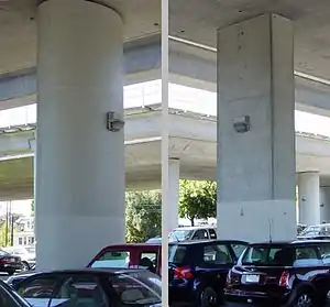 Extensive upgrades over a recent eighteen-month interval have addressed the life safety issues,[28] including replacement of the football players' facilities, and an extensive seismic retrofit of those sections not subject to fault shearing. The work was the subject of several lawsuits from neighborhood and environmental groups, who were concerned about such extensive construction on top of a major fault. During the reconstruction, the Cal Bears have played at AT&T Park in San Francisco for one season.[29] The modifications completed in Summer 2012 involved the cutting of the stadium into four independent sections, followed by the demolition of the two segments directly over the rubble zone. The north and south ends are formed of new bridging sections that rest upon floating mats (foundations that do not penetrate the surface, rather sitting upon plastic sheets over level graded gravel and sand) where they pass over and near the fault, with appropriate sliding connections between the sections for the safety of spectators and the ability to absorb the relative rotation between the east and west fixed sections and the new north and south mobile sections.