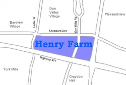 The City of Toronto has officially designated the neighbourhood of Henry Farm to encompass a smaller neighbourhood, Parkway Forest, between Don Mills Road and Highway 404, which is covered in a separate article. The neighbourhood is served by the Henry Farm Community Interest Association.