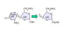 Native heparin is a polymer with a molecular weight ranging from 3 to 30 kDa, although the average molecular weight of most commercial heparin preparations is in the range of 12 to 15 kDa.[42] Heparin is a member of the glycosaminoglycan family of carbohydrates (which includes the closely related molecule heparan sulfate) and consists of a variably sulfated repeating disaccharide unit.[43] The main disaccharide units that occur in heparin are shown below. The most common disaccharide unit is composed of a 2-O-sulfated iduronic acid and 6-O-sulfated, N-sulfated glucosamine, IdoA(2S)-GlcNS(6S). For example, this makes up 85% of heparins from beef lung and about 75% of those from porcine intestinal mucosa.[44]