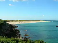 Off the northwestern coast of Herm is the islet of Le Plat Houmet, and beyond that Fondu, which like Herm belongs to Guernsey.[28] In Belvoir Bay on the eastern side of the island are the islets of Mouliere, situated off Frenchman's Point which is to the northeast of the manor village, and Caquorobert.[29] To the south of this off the southeastern coast is Puffin Bay, which contains the islet of Putrainez near the coast and the islet of Selle Rocque further out to the south.[29] The far southwestern point of the island is Point Sauzebourge, and Bishop's Cove is just to the north of this.[28] North of the cove and south along the beach from the harbour and White House are the Rosiere Steps, with a quarry and cottage of the same name in the vicinity. The Mouette and Percee reefs are offshore here. Hermetier, also known as Rat's Island, lies about 250 metres (820 ft) off the western coast between Fisherman's Beach and The Bear's Beach, to the north of the harbour, linked by a low causeway from the beach.[33]