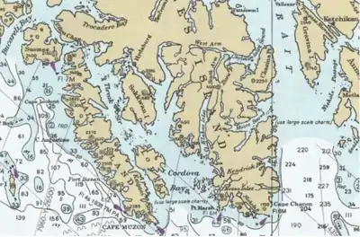 Hetta Inlet is a deep embayment in the southwestern coast of Prince of Wales Island in the U.S. state of Alaska. It connects with the Pacific Ocean through Cordova Bay. The head of the inlet is separated by a 200 feet (61 m) divide from the West Arm of Cholmondeley Sound. The shores are abrupt from the water's edge, and the channels and inlets are deep. The precipitation is probably a little greater than at Ketchikan, and the mean annual temperature is slightly higher. The white crystalline limestone of the Wales series, striking nearly north and south, is the predominant country rock of Hetta Inlet. In it are intruded many igneous rocks, some schistose, some massive. The white limestones are closely folded and have great variation in dip. The igneous rocks, so far as determined from the small collection made, include gabbros, diorites, amphibolites, diabases, and pyroxene-syenites. All these are comparatively massive. The greenstoneschists, which occupy considerable areas, are chloritic.[1]