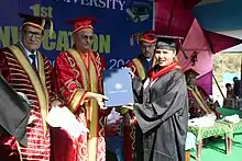 Himalayan University conducted its 1st Convocation on 22-Dec-2017 at its campus in Jullong, Itanagar. Around 410 alumni were entitled to award with degrees from different disciplines including tudents from Faculty of Arts, Faculty of Commerce, Faculty of Education,B.ed (Spl.Ed), Faculty of Science, Faculty of Humanity & Social Studies , Faculty of Library Science, Faculty of Social Work, Faculty of Naturopathy Medicine, Faculty of Law , Faculty of Engineering & Technology, Faculty of Fine Arts and Pmanyerforming Arts,and many more. The occasion was graced by attending the programme by Swami Vishweshananda from R.K Mission Hospital Secretary as chief guest and by Shri Ravinder Sathe from Rambhau Mhalgi Prabodhini as Guest of honor where they direct the students to do best in their career and not to forgot the learning taught by Himalayan University while implied in every phase of life and they also added few lines in their speech that students need to identify their potential and greets with best wishes for their future endeavor.