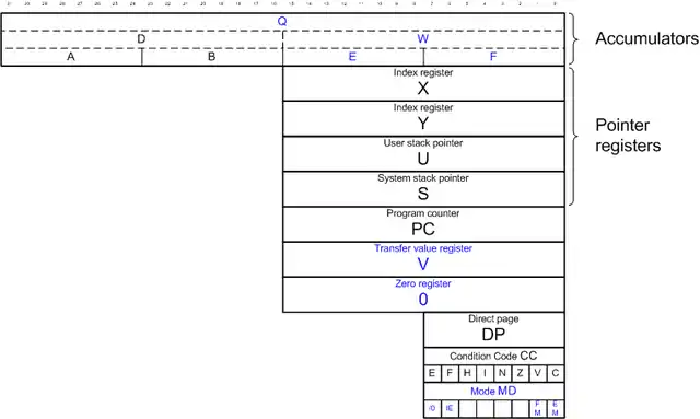 - Two 8-bit accumulators: 'E' and 'F'. These can be concatenated to form 16-bit accumulator 'W'. The existing 6809 16-bit accumulator D can be concatenated with W to form 32-bit accumulator 'Q'. It is likely that D is short for 'Double' and Q for 'Quad', the number of bytes they hold.