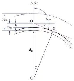 When the observer is elevated, the horizon zenith angle can be greater than 90°. The maximum visible zenith angle occurs when the ray is tangent to Earth's surface; from triangle OCG in the figure at right,