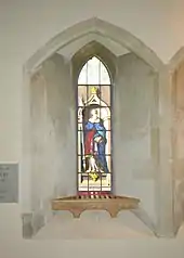 Around 1400 the present west tower and tower arch were built. The tower arch features two unusual almost life-size sculptures of human figures: one playing the bagpipes and the other showing an expression of amazement.[7] Also in the 15th century the pitch of the nave roof was greatly reduced in typical Perpendicular Gothic style.[7] Late in the 15th century, Perpendicular Gothic windows were inserted in both sides of the chancel and the north wall of the nave. The Perpendicular Gothic piscinae in the chancel and south transept are also 15th century.[3]