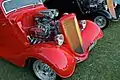 In the '50s and '60s, the Ford flathead V8 was supplanted by the Chrysler FirePower engine (known as the "early hemi"). Many hot rods would upgrade the brakes from mechanical to hydraulic ("juice") and headlights from bulb to sealed-beam.[12] A typical mid-1950s to early 1960s custom Deuce was fenderless and steeply chopped, powered by a Ford or Mercury flathead,[13] with an Edelbrock intake manifold, Harman and Collins magneto, and Halibrand quick-change differential.[14] Front suspension hairpins were adapted from sprint cars, such as the Kurtis Krafts.[15]