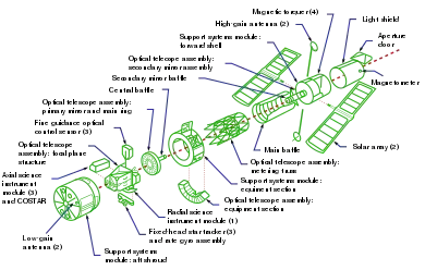 The spacecraft in which the telescope and instruments were to be housed was another major engineering challenge. It would have to withstand frequent passages from direct sunlight into the darkness of Earth's shadow, which would cause major changes in temperature, while being stable enough to allow extremely accurate pointing of the telescope. A shroud of multi-layer insulation keeps the temperature within the telescope stable and surrounds a light aluminum shell in which the telescope and instruments sit. Within the shell, a graphite-epoxy frame keeps the working parts of the telescope firmly aligned.[37] Because graphite composites are hygroscopic, there was a risk that water vapor absorbed by the truss while in Lockheed's clean room would later be expressed in the vacuum of space; resulting in the telescope's instruments being covered by ice. To reduce that risk, a nitrogen gas purge was performed before launching the telescope into space.[38]
