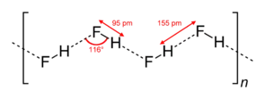 Although a diatomic molecule, HF forms relatively strong intermolecular hydrogen bonds. Solid HF consists of zig-zag chains of HF molecules. The HF molecules, with a short H–F bond of 95 pm, are linked to neighboring molecules by intermolecular H–F distances of 155 pm.[4] Liquid HF also consists of chains of HF molecules, but the chains are shorter, consisting on average of only five or six molecules.[5]