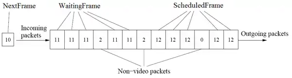 Here the video frames priority numbers are 10 and higher. The packets with priority number 12 belong to the frame scheduled for sending, and the packets with number 11 belong to the waiting frame. On the figure a packet which belongs to the next frame is about to enter the buffer.