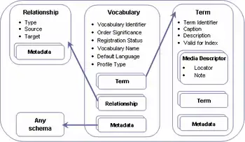 Structural a vocabulary has an identifier, title and a list of terms. Each term has a unique key, titles and (optional) descriptions. A term may have nested terms, thus a hierarchical structure can be created. It is possible to define relationships between terms and add custom metadata to terms.