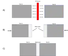 Surface heating includes heating and melting of the interface between plastic parts with IR radiation and forcing the parts together into a molten joint that solidifies as one part. This process can be split into 3 phases as shown in the figure to the right: A) Loading of parts, insertion of the IR source, and IR application. B) Change-over with the removal of IR source and clamping of the parts to join them. C) Unloading of the parts after the weld was made.[1]