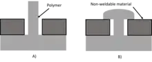 IR staking includes the localized welding of a thermoplastic stud from one part into the cavity of a non-weldable part to form a mechanical fastener. As shown in the figure to the right, the polymer part and non-weldable part are first placed together (A), then the excess polymer is melted and formed around the non-weldable part to fasten the two part together (B). The stud can be heated through directed TTIr when pre-placed within the cavity of an IR transparent part, then melted to deform it into a button shape required to fill the cavity before solidifying. Surface IR radiation can also be used to soften the plastic stud and press it into a button-shaped forming head, forcing the stud to deform into the shape of the forming head before solidifying.[1]