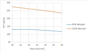 Immersion lithography tools currently boast the highest throughputs (275 WPH) as targeted for high volume manufacturing.[11] This is achieved through higher stage speeds,[12][13] which in turn, are allowed by higher power ArF laser pulse sources.[14] Specifically, the throughput is directly proportional to stage speed V, which is related to dose D and rectangular slit width S and slit intensity Iss (which is directly related to pulse power) by V=Iss*S/D. The slit height is the same as the field height. The slit width S, in turn, is limited by the number of pulses to make the dose (n), divided by the frequency of the laser pulses (f), at the maximum scan speed Vmax by S=Vmax*n/f.[12] At a fixed frequency f and pulse number n, the slit width will be proportional to the maximum stage speed. Hence, throughput at a given dose is improved by increasing maximum stage speed as well as increasing pulse power.