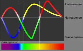 A chimerical color is an imaginary color that can be seen temporarily by looking steadily at a strong color until some of the cone cells become fatigued, temporarily changing their color sensitivities, and then looking at a markedly different color. The direct trichromatic description of vision cannot explain these colors, which can involve saturation signals outside the physical gamut imposed by the trichromatic model. Opponent process color theories, which treat intensity and chroma as separate visual signals, provide a biophysical explanation of these chimerical colors.[3] For example, staring at a saturated primary-color field and then looking at a white object results in an opposing shift in hue, causing an afterimage of the complementary color. Exploration of the color space outside the range of "real colors" by this means is major corroborating evidence for the opponent-process theory of color vision. Chimerical colors can be seen while seeing with one eye or with both eyes, and are not observed to reproduce simultaneously qualities of opposing colors (e.g. "yellowish blue").[3] Chimerical colors include: