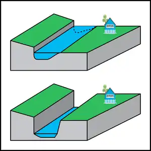In geomorphology, the term incised refers to when a river has cut downward through its riverbed. The river may have been incising through sediment or bedrock. The river begins at one elevation and incises downward through its bed while leaving its floodplain behind (higher). Although, it is possible for the floodplain to be lowered at the same time. Examples include Mobile Bay along the Gulf of Mexico.