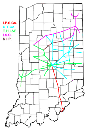 The late 1890s was a time of horse-drawn carriages and wagons pulled along unpaved streets and roads, so the arrival of the town streetcar was appreciated. Some of these trolley lines eventually expanded into the countryside and by 1911 grew into hundreds of miles of interurban lines networked across Indiana. "When before we had moved by horse and carriage, we now rode on plush seats to places 20 miles (32 km), 30 miles (48 km), even 50 miles (80 km) distant."[1] In 1930, this unprofitable network became the new Indiana Railroad interurban. The plan was to increase both passenger and freight business and improve efficiency. A brief description of these IR predecessor interurban companies follows.