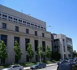 The first attempts to have a state library started when Indiana was still a territory with its capital in Corydon, making it the oldest agency of the Indiana government.[2] However, the first actual Indiana state library would not be opened until the capital had moved to Indianapolis, starting on February 11, 1825, with the secretary of state acting as librarian. In 1867, the library's law books were transferred to the Supreme Court to begin the Supreme Court Law Library, which has grown to 70,000 volumes.[3] The library became its own institution in 1841. The State Board of Education gained control of the library in 1895, with the Department of Education gaining control in 1933. Between 1895 and 1933, the library amassed more material than it had in all its previous existence. Originally, the Library was only for the use of state employees and government officials. After assigning a two-cent tax to attain funds in 1929, and having architects send proposals for a new building in 1931, it was built to designs by Pierre & Wright Architects.
