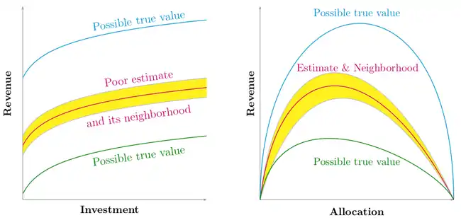 As indicated by the picture, since info-gap robustness model applies its Maximin analysis in an immediate neighborhood of the estimate, there is no assurance that the analysis is in fact conducted in the neighborhood of the true value of the revenue. In fact, under conditions of severe uncertainty this—methodologically speaking—is very unlikely.