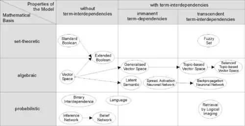 For effectively retrieving relevant documents by IR strategies, the documents are typically transformed into a suitable representation. Each retrieval strategy incorporates a specific model for its document representation purposes. The picture on the right illustrates the relationship of some common models. In the picture, the models are categorized according to two dimensions: the mathematical basis and the properties of the model.