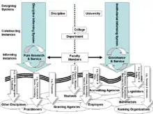 As illustrated in Figure 4, Gill and Bhattacherjee (2007) further expanded the concept with the example of academic informing systems, which can be described in terms of two related informing systems that share many of the same clients. The disciplinary system represents the research field with which faculty members and departments are aligned. The institutional system represents the activities of the college or university, primarily focused on informing student clients. In subsequent publications (e.g., Gill, 2009a), informing science researchers have also begun to address the issue of how such systems can evolve, as opposed to being a pure product of design. The importance of understanding these informal processes for informing system development—even for IT-based systems—has been underscored by the rapid acceptance of technologies such as social media. There is little question that users have adapted these technologies for their own informing purposes in ways far beyond those anticipated by the original designers of the systems.